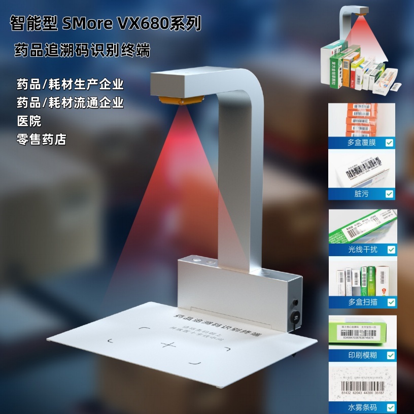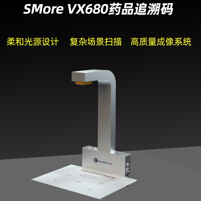 SMore VX680识别终端是一款专门用于药品追溯码批量读取的AI智能识别终端。它搭载一款高性能4核AI芯片。融合了医药行业专用的解码图像处理技术,能够一次性采集录入大批量的多规格药品码数据。能够很多程度提高医药行业的工作效率。助力药品药监码全流程合规监管。