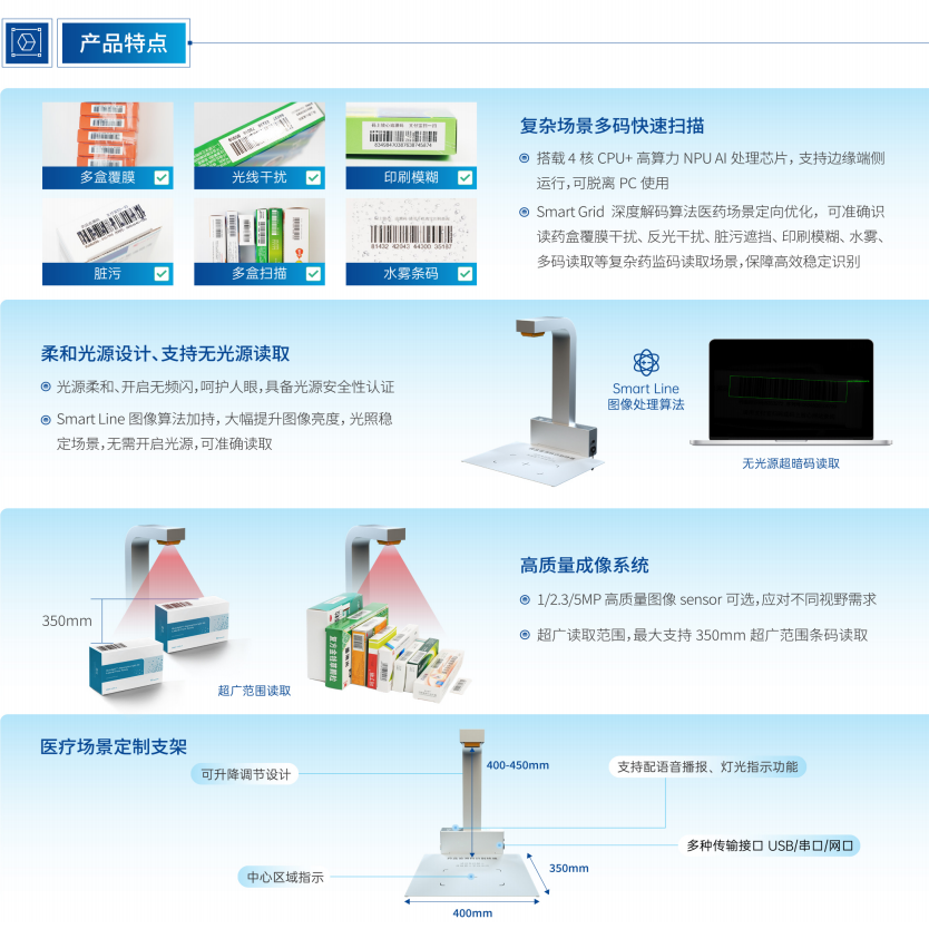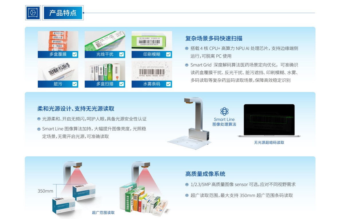 Smart Grid 深度解码算法医药场景定向优化,能够准确快速识别药盒覆膜干扰,反光干扰,脏污遮挡、印刷模糊,水雾多码读取等复杂药监码读取场景,且能够进行稳定高速识别。