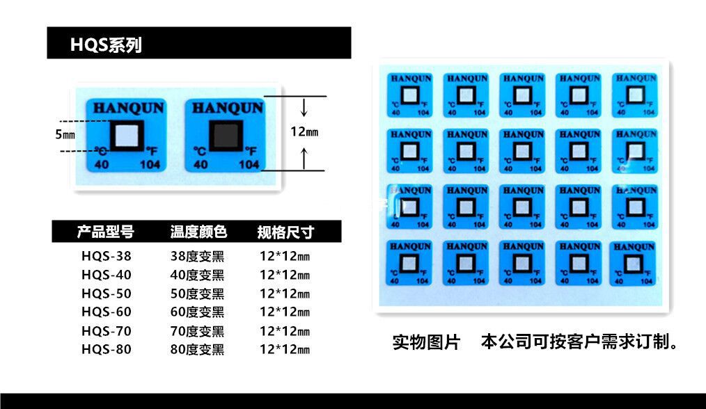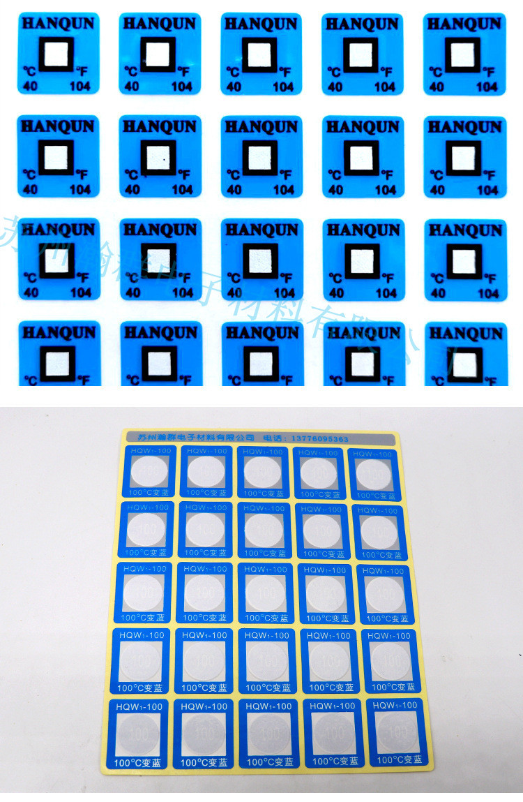 40度变色不可逆测温贴片具有独特的变色示温、反光显示及温度记录功能,自身带有压敏胶,应用于变电所母线的连接部位,也可贴在母线与设备接线端子的连接处及隔离开关的触头上,还可贴在变压器、电容器、电机等电气设备的外壳上,用来监视母线连接处及电气设备外壳的温度。一旦监温部位温度达到或超过测温贴片的额定温度,变色测温贴片立即变色,并在测温贴片上显示该处超温的数字,尤其是在夜间,该测温贴片具有反光显示功能。无论是白天还是夜间,都很容易被人在巡视中发现监温部位温度升高的状况,从而找出故障隐患,防止事故的发生。