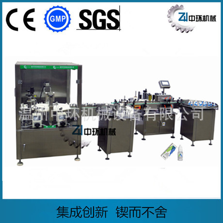 该设备分为转盘进瓶、自动灌装、自动喷头盖(滴管盖)、旋盖、贴标、收瓶等几个操作。