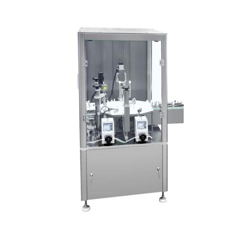 机器特点:ZHJY-50全自动妆前乳乳液灌装旋盖机是一台通过活塞式定量进行充填,然后振动盘理盖进行下盖,再用机械手完成伺服旋盖的包装机器。本实用新型涉及一种灌装旋盖机用观测装置,涉及早餐包装设备领域,旨在解决豆浆在包装过程中,灌装旋盖机工作时,旋盖机上方设有振动盘,振动盘位置较高,振动盘中旋盖情况观测的问题,其包括在振动盘旁侧设置的观测架,所述观测架上端设置的观测镜,本实用新型通过向振动盘一侧倾斜设置的观测镜,能够直接在观测镜中观察到振动盘,从而实现对振动盘中旋盖的观测.