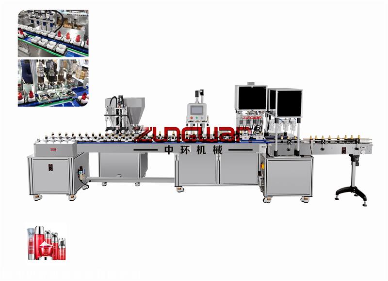 ZHSR-4C直线式水乳灌装旋盖一体机适用于2-200ml的圆形,异形塑料瓶或玻璃瓶的液体、乳液、流体的自动灌装、压内塞,上外盖、旋盖。具有定位准确,传动平稳,计量准确,简单等优点。伺服电机驱动滚珠丝杆带动活塞式气缸泵(陶瓷柱塞泵)灌装,灌装计量准确,灌装不滴漏,具有无瓶不灌装功能;采用人工放内塞、上外盖,上塞(盖),适合规格多样,稳定可靠,具有无瓶不上内塞、外盖功能;采用伺服电机带动旋盖头,扭矩大小触摸屏调节。整机均按GMP要求设计。