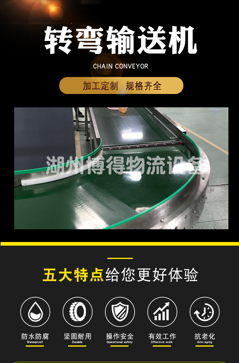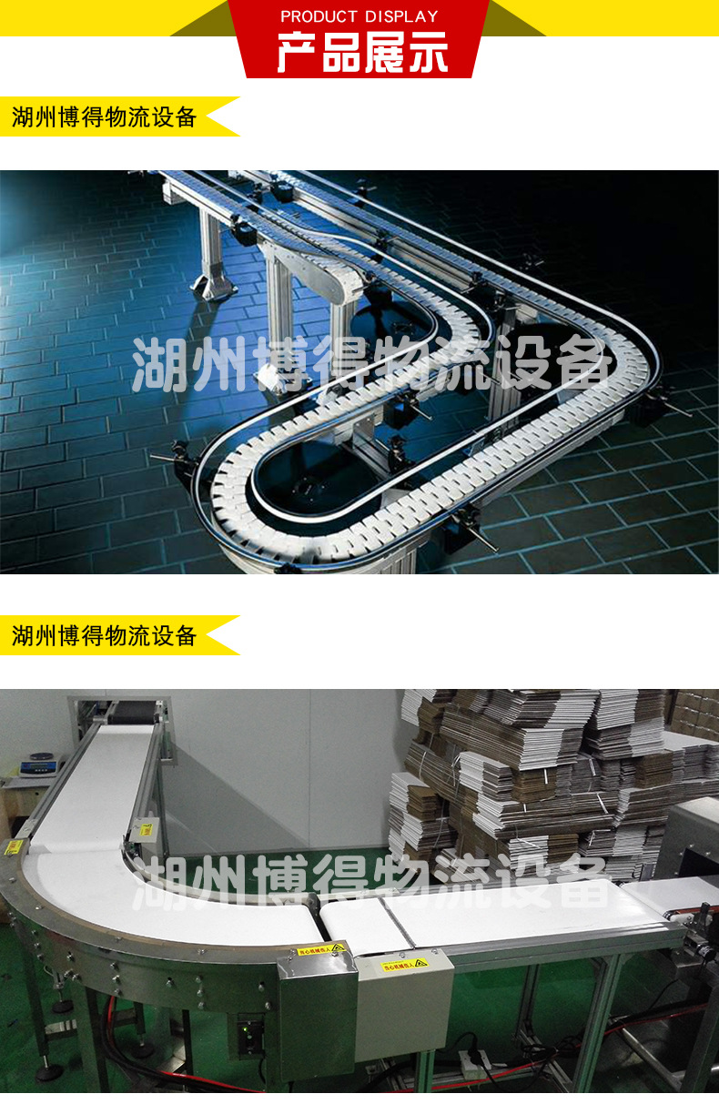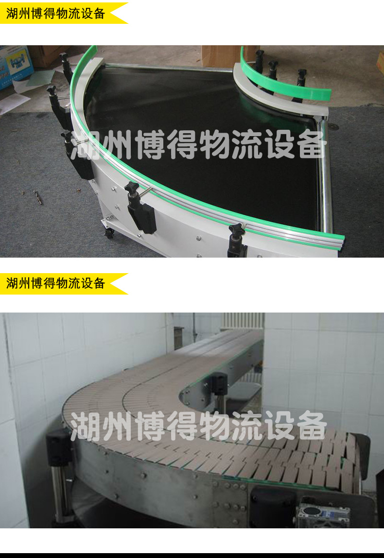 输送链板有POM材质和不锈钢及不锈铁3种,转弯形式有带翼转弯和磁性转弯2种。
