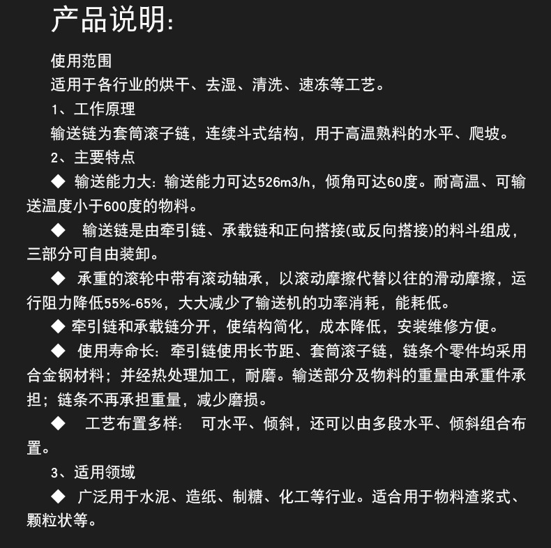 2、链板有不锈钢和工程塑料等材质、规格品种繁多,可根据输送物料和工艺要求选用,能满足各行各业不同的需求;