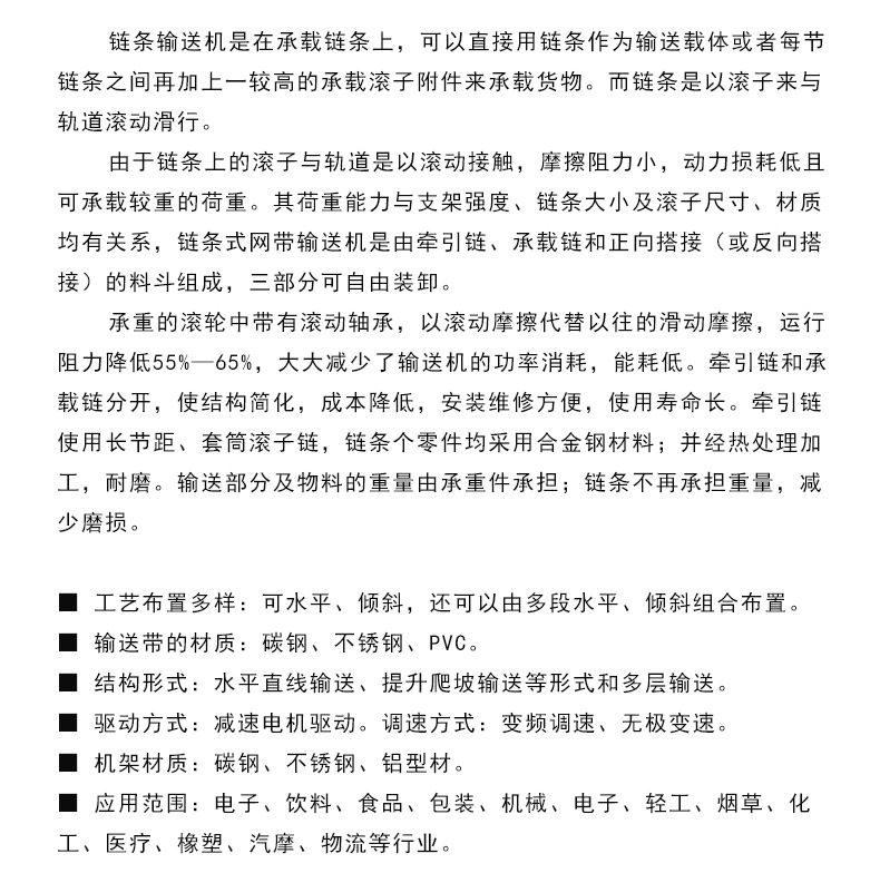 辊道输送机、皮带输送机、网带输送机、链式输送机、链板输送机、各式专用提升设备、自动卸载设备、仓储设备