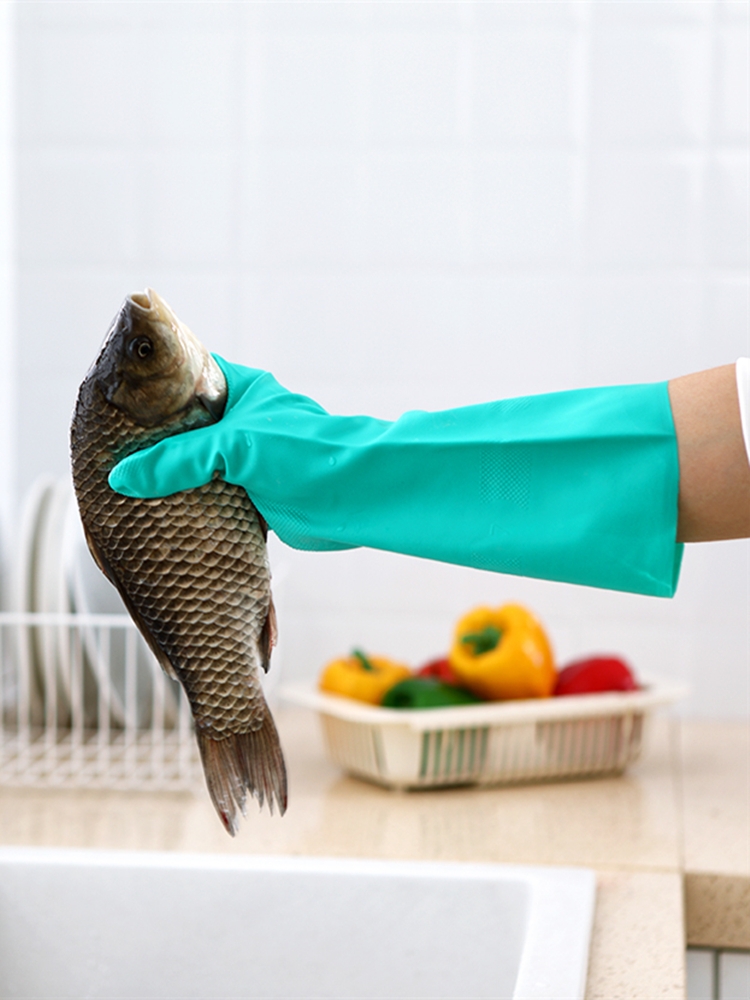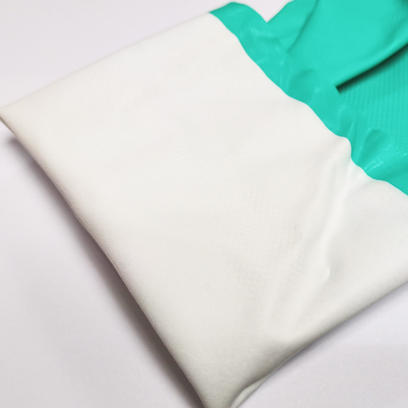 材质:绿色丁腈工业手套植绒衬里。直袖口。