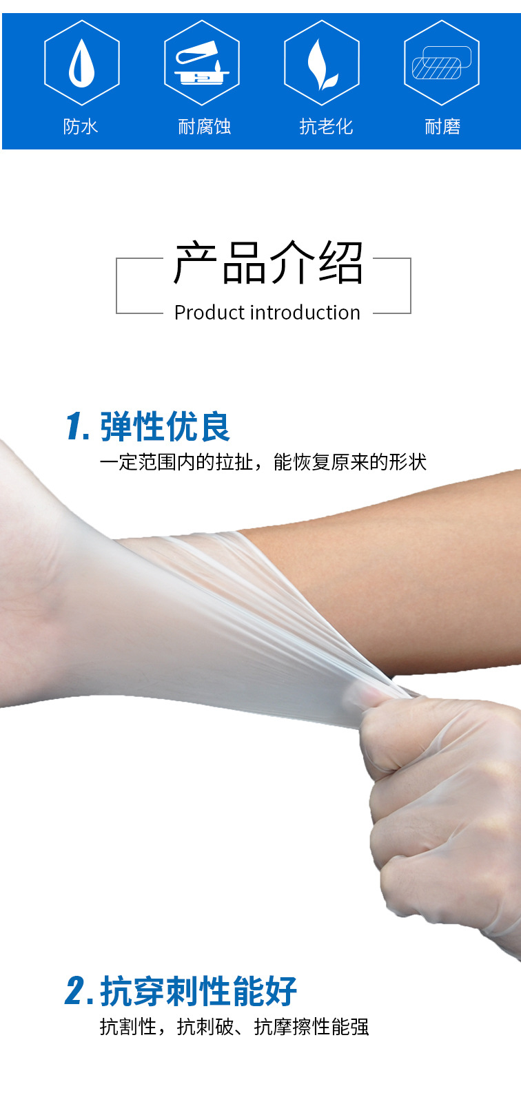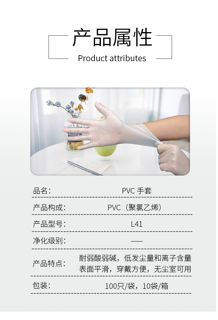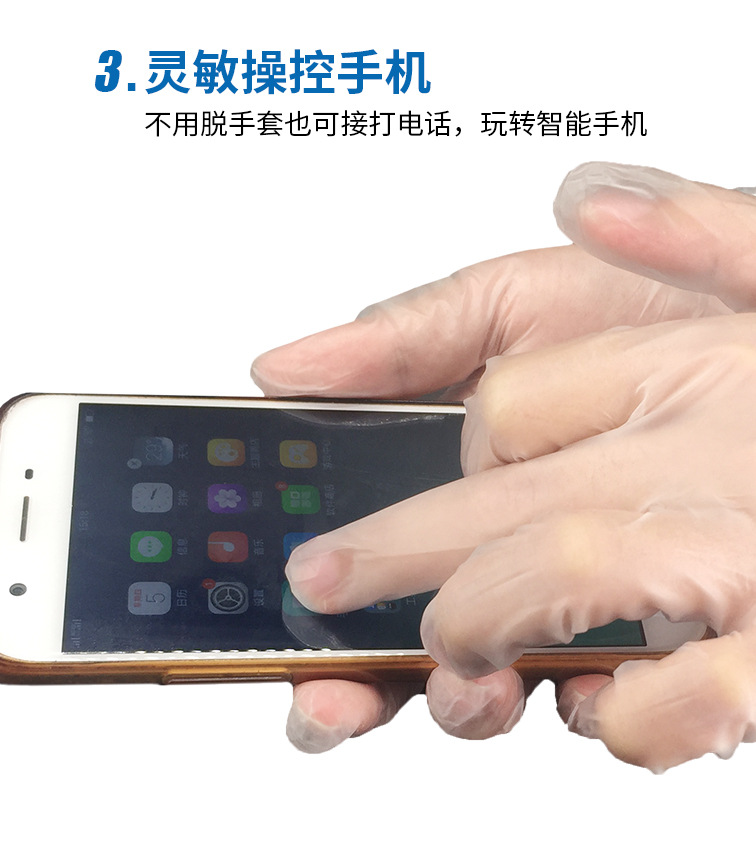 兴业卓辉PVC手套,产品特点耐弱酸弱碱,低发尘量和离子含量,表面平滑,穿戴方便 无尘车间可用,100只一袋,10袋一箱,产品有三大特性: 弹性优良,一定范围内的拉扯,能恢复原来的形状。第二 抗穿刺性能好,抗割性 抗刺破 抗摩擦能力强 第三灵敏操作手机,不用脱脱手套也可接打电话,玩转智能手机