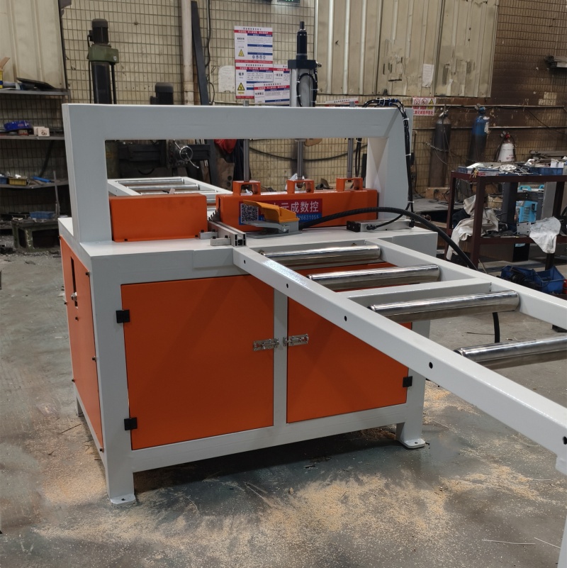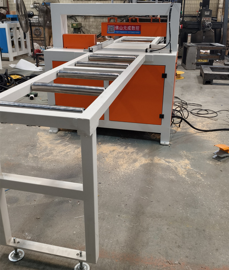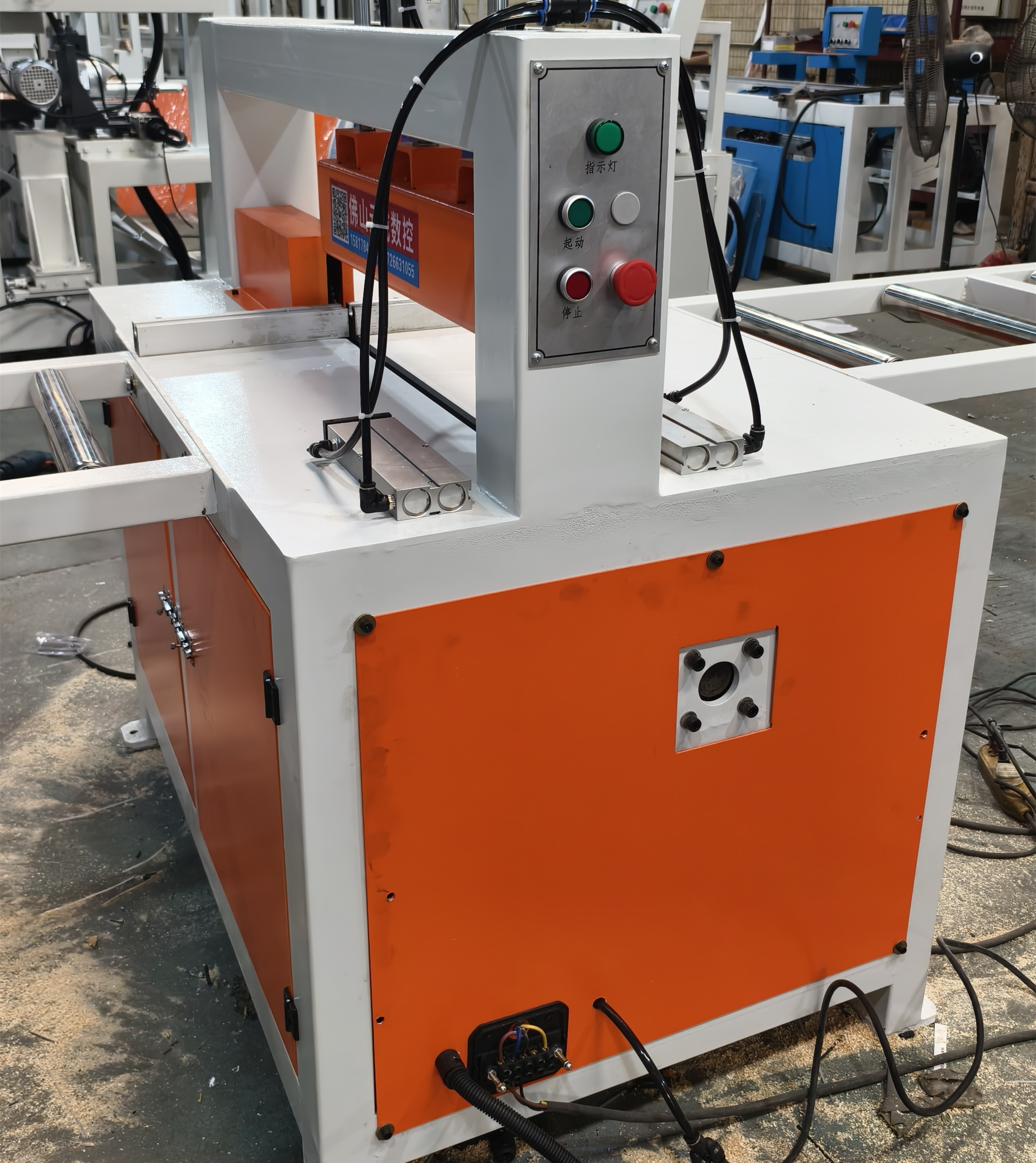 有效宽度为500mm,可以多根材料同时切割,气动紧压材料,锯片自动前推切割。切割完材料后,退回防护门内,确保机械使用的安全保障。右左两边配有带标尺定位的滚筒附加台面,切割材料推送轻松,断料尺寸准。