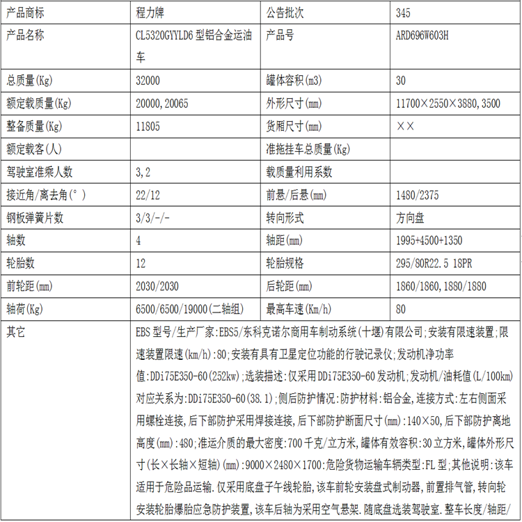 国六--D320,DDI75E350-60,变速箱9JS135TA,前桥5.5吨,后桥10吨单减,350L铝油箱,带空调,电动玻璃,自动钥匙,行车记录仪,气囊座椅,危险品底盘法规标配,底盘采用前盘后鼓制动方式。295真空胎。EBS电空制动系,FCWS/LDWS前撞/车道偏离预警,TPMS前轴单台胎压监测。