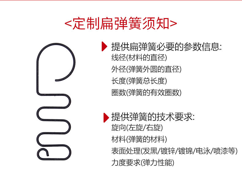 公司生产的弹簧分类有压缩弹簧(普通压缩弹簧,中凹压缩弹簧,中凸压缩弹簧,塔型压缩弹簧,渐近压缩弹簧,左旋压缩弹簧,右旋压缩弹簧)、扭转弹簧(普通扭转弹簧,双扭转弹簧,异形扭转弹簧,左旋扭转弹簧,右旋扭转弹簧)、拉伸弹簧(普通拉伸弹簧,单钩拉伸弹簧,双钩拉伸弹簧,挂钩拉伸弹簧,拉环拉伸弹簧,非密圈拉伸弹簧,左旋拉伸弹簧,右旋拉伸弹簧)、异形弹簧、涡卷弹簧、卡簧挡圈、波形弹簧、碟形弹簧、冲压件等弹性元件。