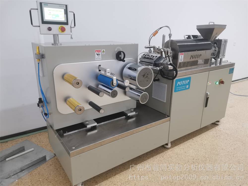 小型平挤流延膜复合成型试验机由机架、主电机、进料系统、挤出系统、模头组件、流延辊组件、切刀组件、牵引辊组件、收卷组件、放卷组件等组成。