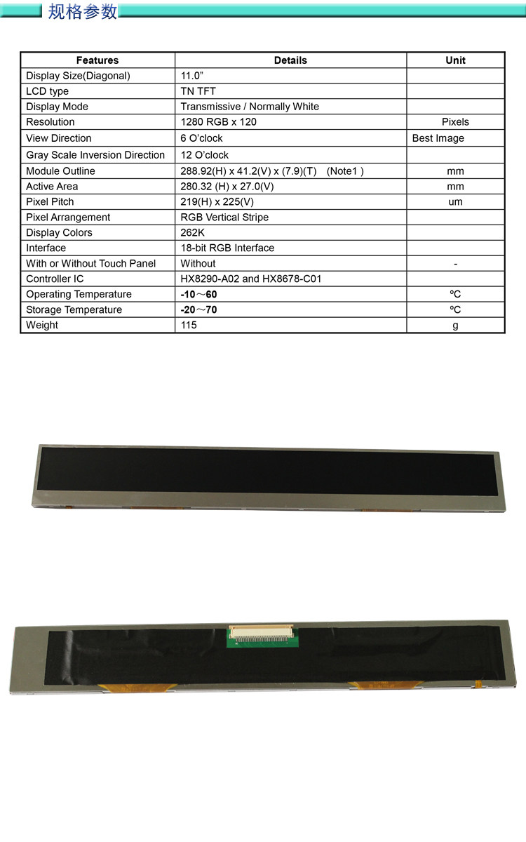 品牌:冠显 品名:11寸TFT长条屏 型号:TL110WSXH02 分辨率:1280*120 接口:RGB