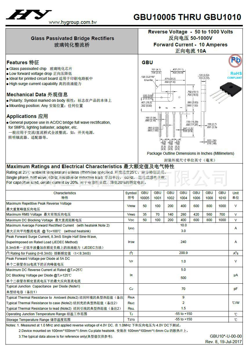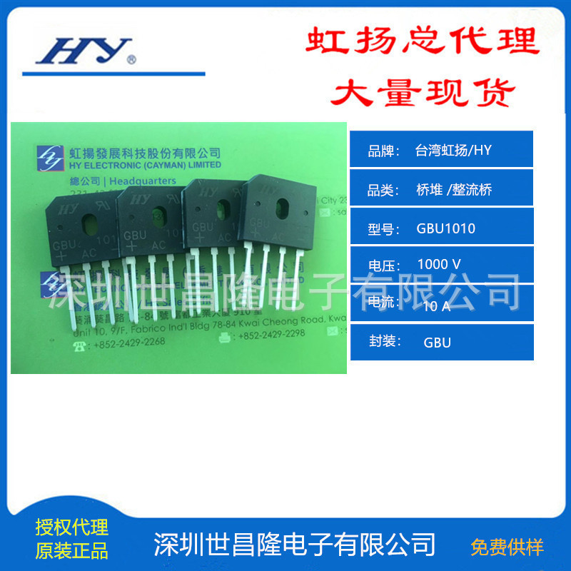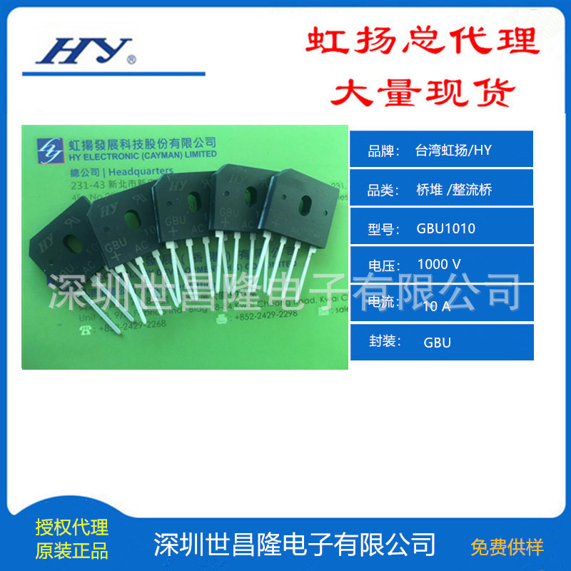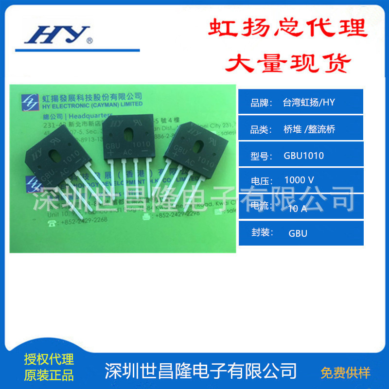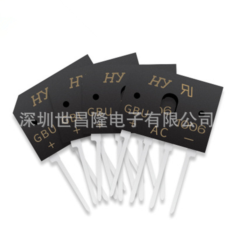 台湾虹扬扁桥GBU封装 10A的主要型号:GBU10005、GBU1001、GBU1002、GBU1004、GBU1006、GBU1008、GBU1010