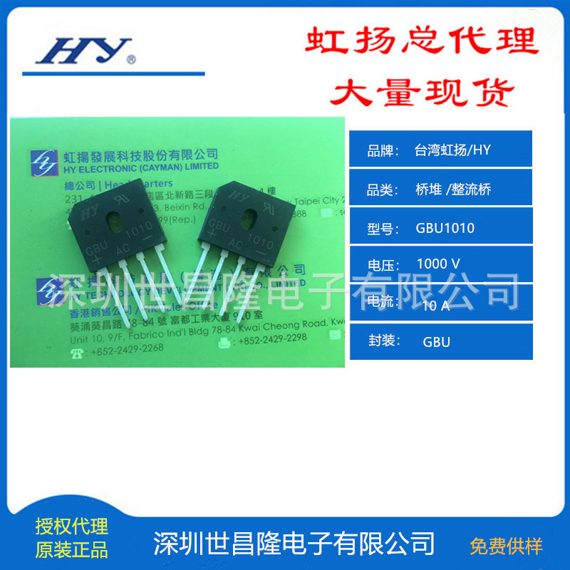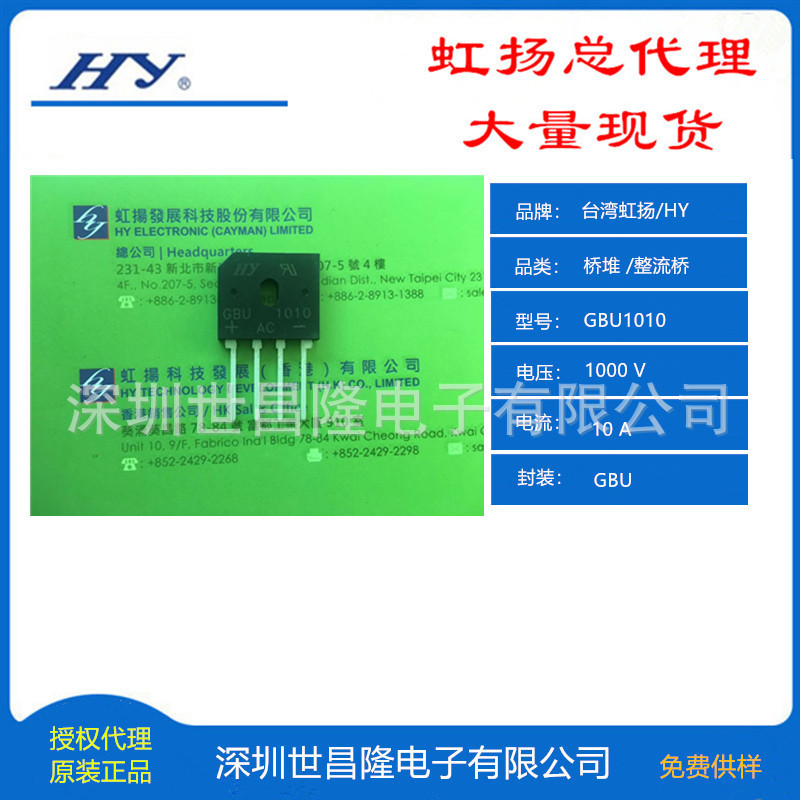 深圳世昌隆电子有限公司是台湾虹扬/HY 原厂正规授权代理商! 品牌简介 台湾HY/虹扬是全球大型分离式半导体元器件制造商之一,主要产品包含:1、二极管 (一般二极管,极快恢复二极管,肖特基Schottky,TVS管,齐纳二极管 Zener ) 2、桥堆 (贴片桥,圆桥,方桥,扁桥,三相桥) 购买须知