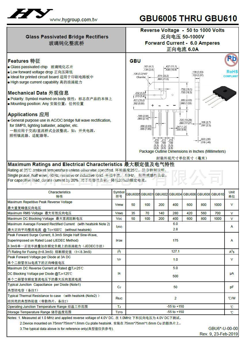 产品应用: GBU610 是一款薄扁型桥堆,主要应用于各类电源,适配器,镇流器,电风扇,电视机,空调及各种小家电产品上。