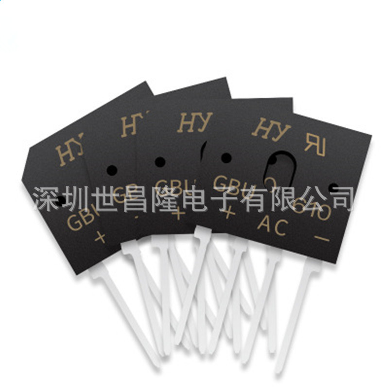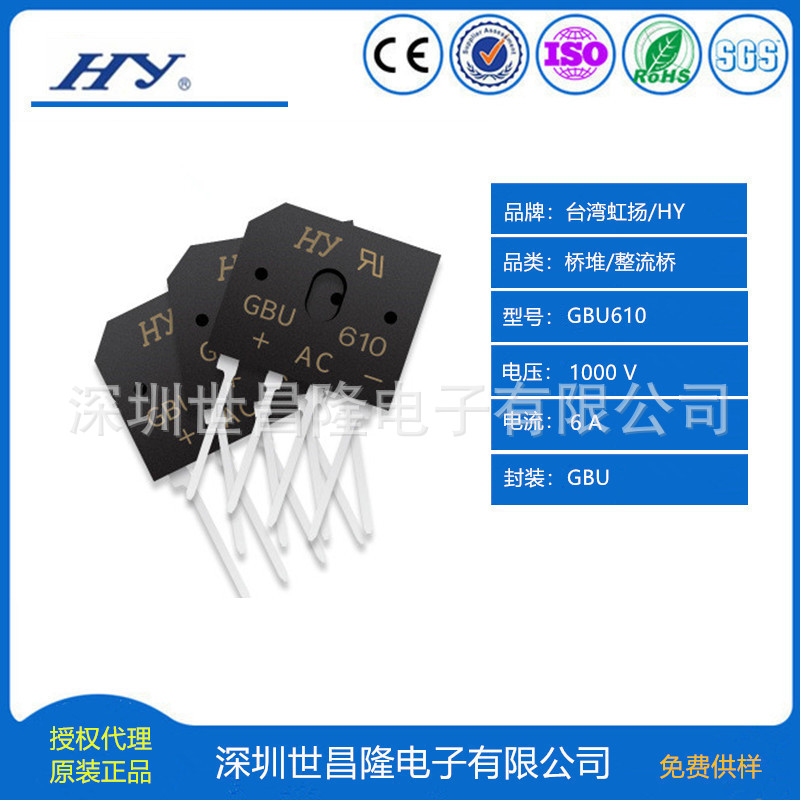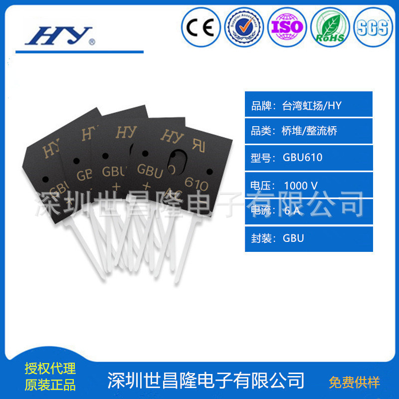 虹扬二极管、桥堆的主要客户有:格力,美的,海尔,飞利浦,海信,大金,茂硕电源,拓邦,振邦智能,易事特电源,侨威,伟创力等。 产品展示 台湾虹扬扁桥GBU封装 6A的主要型号:GBU6005、GBU601、GBU602、GBU604、GBU606、GBU608、GBU610