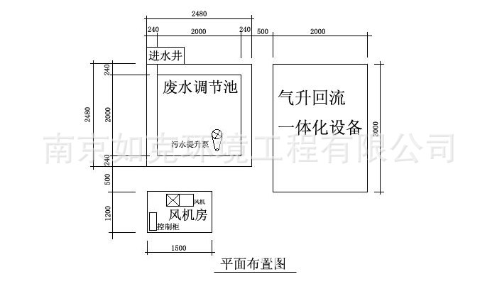 (7)(如采用风机曝气)风机房、自动控制柜:风机房单独设置,内装二台风机(一用一备),风机房和微机控制柜为一体,风机房出风管和设备进风管相连结,其距离不超过15米,其尺寸和详细说明见表2。