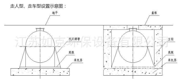 如设备埋设在地坪以下,基础标高必须小于或等于设备标高并保证下雨不积水,基础一般是素混凝土(是否配筋视当地地质情况而定)。为提防设备上浮,基础应预埋抗浮环。(详见设备安装图)