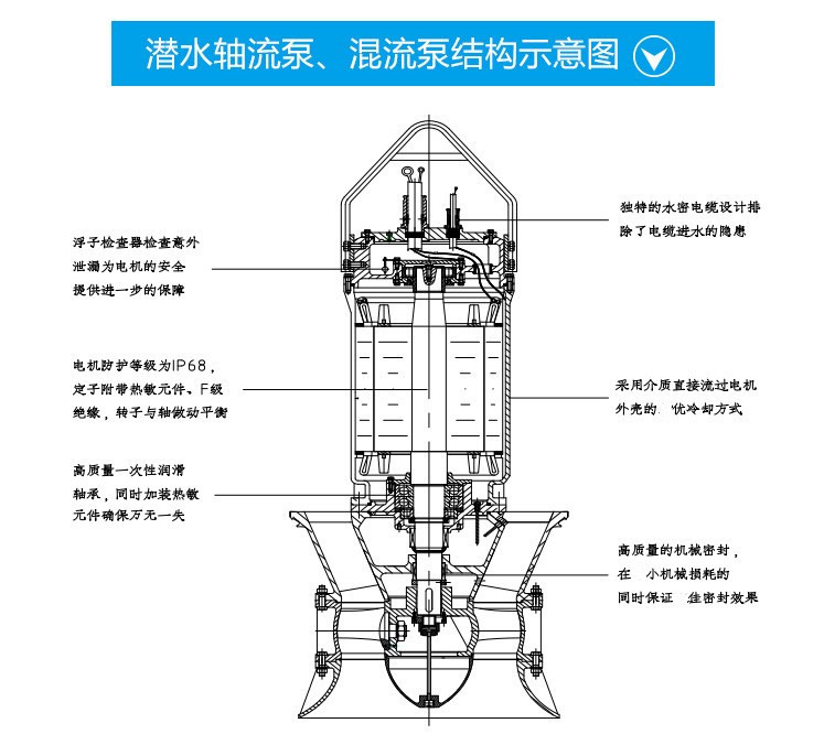 ZQB型潜水轴流泵和HQB型潜水混流泵是我公司在消化吸收国内技术的基础上,与国内高等院校共同研制的新型泵类产品,它具有工程投资少,维护管理方便,运行条件好,工作可靠性高及有利于自动化等优点。它广泛应用于农田排灌,工矿船坞,城市建设,电站给排水和水利工程中。