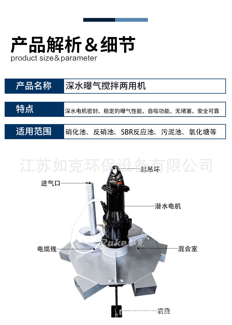 SBJ 型深水曝气搅拌机是机电技术和生化技术的集成产品,它专为解决高浓度有机废水,在生化处理过程中实现高 效率充氧的专用设备;主机采用双速电机设计,具有高速曝气低速搅拌的双重功效,加之潜水深度可达 20m 的工作性能,是传统曝气设备无可替代的产品SBJ 型深水曝气搅拌机主要应用在硝化/反硝池、SBR 反应池、污泥池、氧化塘以及需要进行深水曝气搅拌和要求氧转移率高的场所