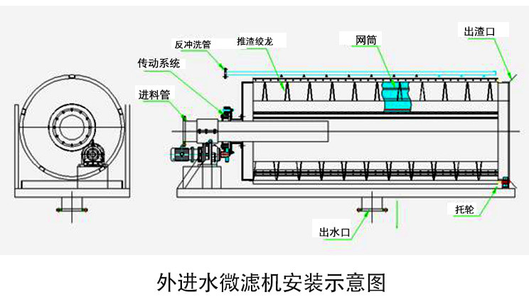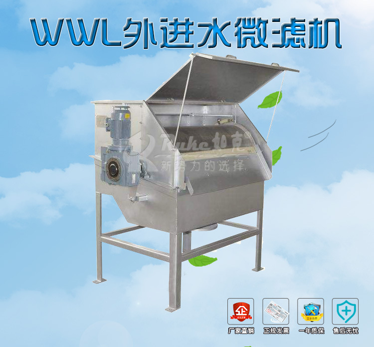 使用范围外进水膜格栅叫外进水微滤机,也称转鼓过滤 机, 该设备可以去除水中直径 0.25mm 以上 的细小颗粒,适用于造纸、制革、屠宰、酿酒、 食品、化纤和纺织等各种行业的污水处理领域。 工作原理交流调速电机通过减速机驱动栅网筒体,污水 通过进水阀到水箱,经过缓冲均布箱隔板上升 到过滤水位线,净水通过栅网缝隙进入存水箱 体,并在底部向外排出,同时清洗了栅网,大于栅网间隙的杂质及纤维类有机质,被栅网卸 至出渣料斗处理后的垃圾含水量比原来的内进 水微滤机低 30%~50%。