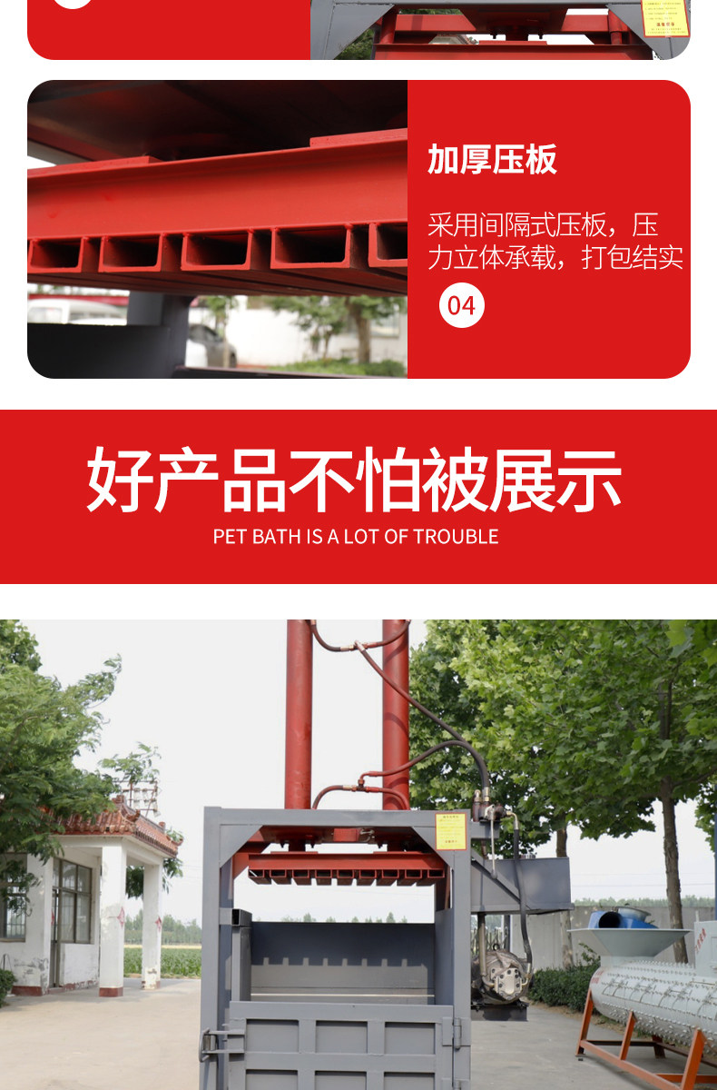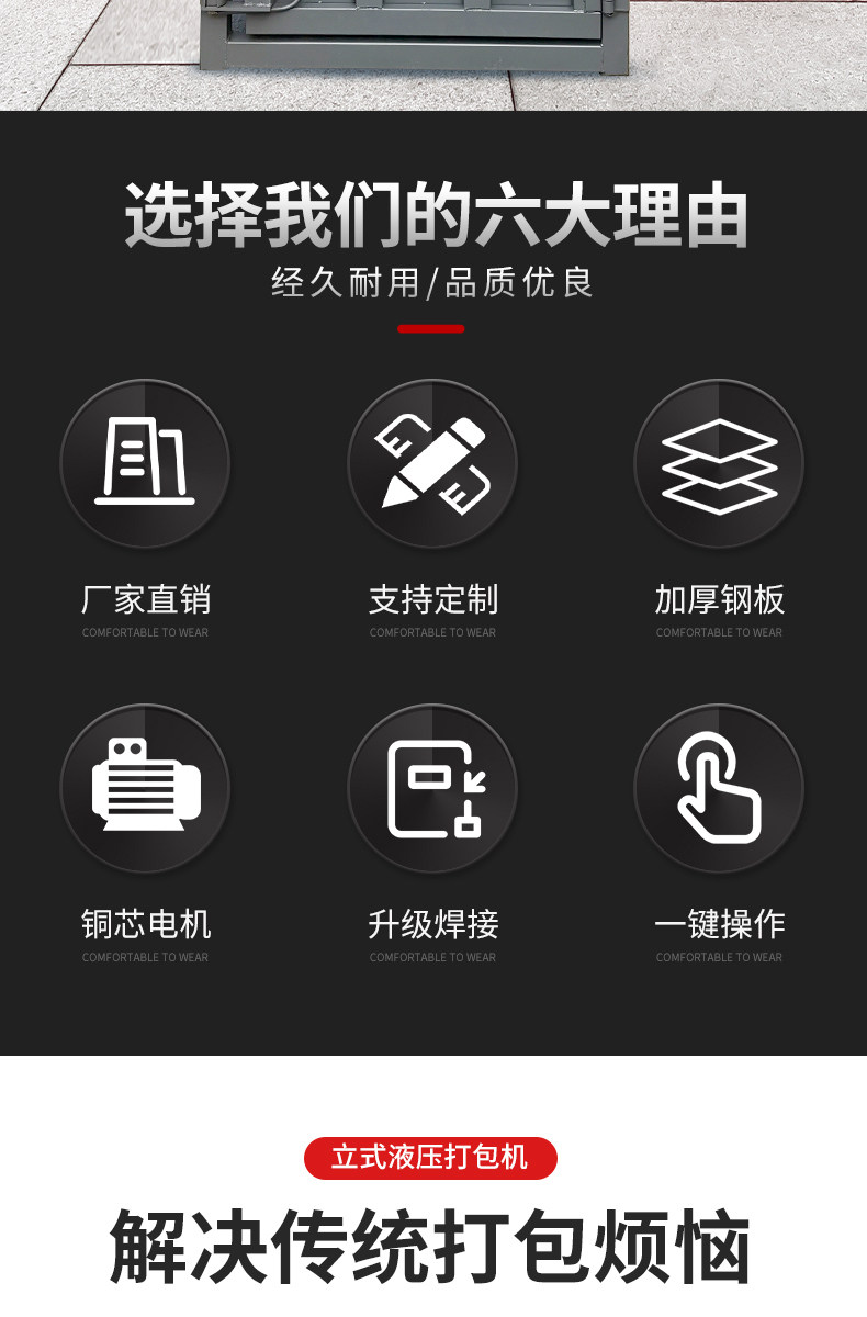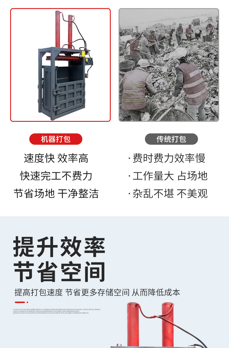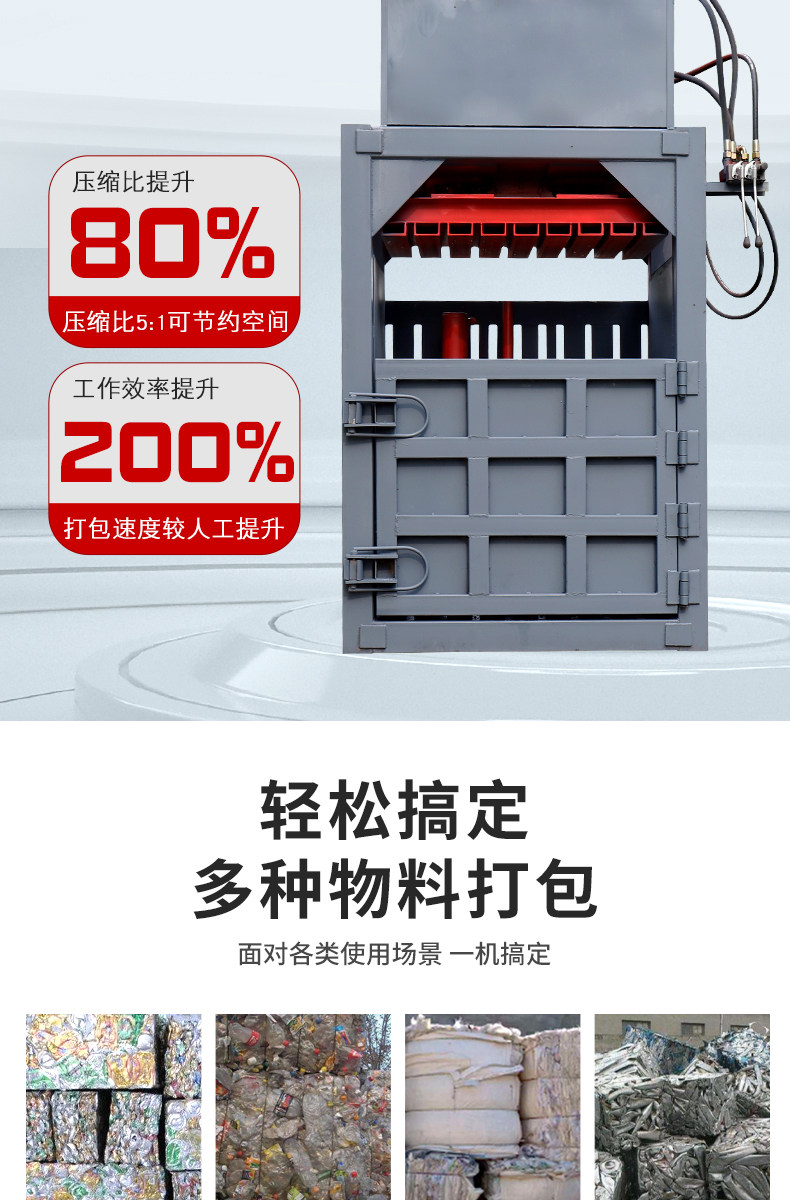适用于、药材、废纸打包、棉花打包、服装打包、秸杆打包、塑料打包、羊毛打包、可回收垃圾打包,亦可应用于棉、羊毛、废纸箱、废纸板、纱线、烟叶、塑料、布匹、编织袋、针织绒、麻、麻袋、毛条、毛球、茧、蚕丝、啤酒花、废塑料袋等一切轻泡、松散物料等松软类物料进行压缩打包,包型紧凑,整齐美观,可大幅度降低运输成本,是棉产区、纺织企业、服装厂、废旧物质回收站和其他各种轻工业企业必备的生产工具。