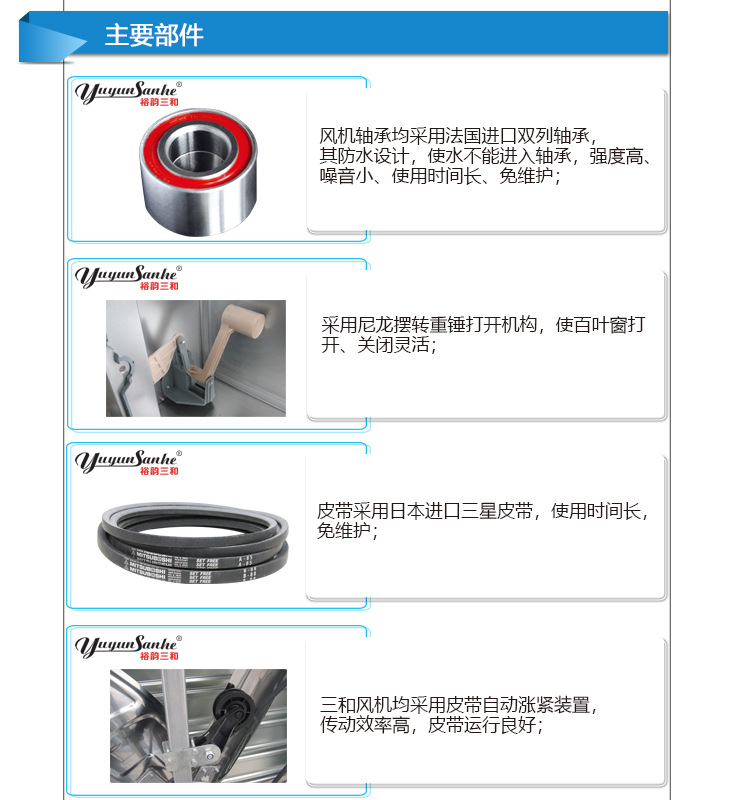 皮带轮均采用高强度铝镁合金压铸制成,重量轻,耐腐蚀性能强,减轻扇叶重量;三根加强筋皮带轮设计,表面经过喷砂处理,提高美观度,消除内应力,有效提高了自身强度,永无断裂;