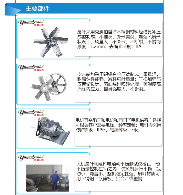 扇叶采用克虏伯自洁不锈钢材料经模具冲压成型制成,不挂灰、外形美观;加强风扇形状设计,风量大、不变形、不断裂、风量如一;不锈钢厚度:1.2mm、表面光洁度: