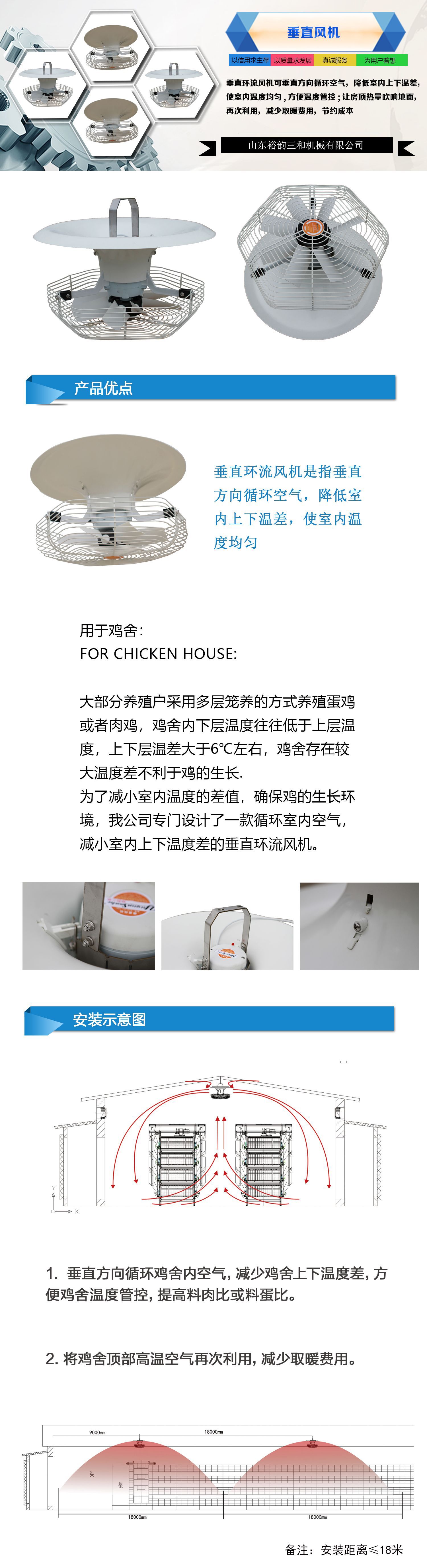 2.为了减小室内温度的差值,确保鸡的生长环境,我公司专门设计了一款循环室内空气,减小室内上下温度差的垂直环流风机;
