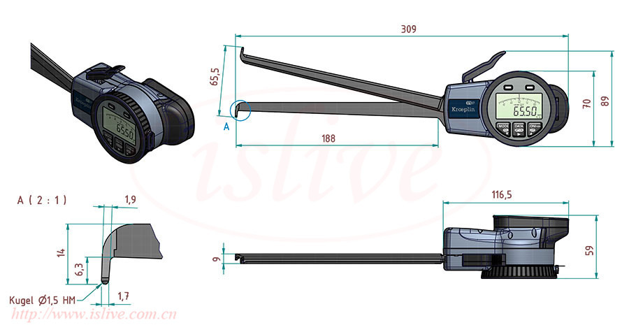 KROEPLIN641E-312数显内径卡规,测量范围为15.00mm-65.00mm,测量深度:188mm;测点形式为球形Φ1.5,用途为:内径测量,深孔测量