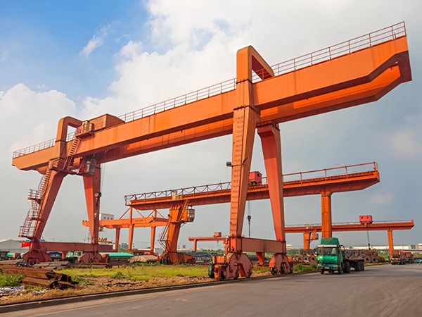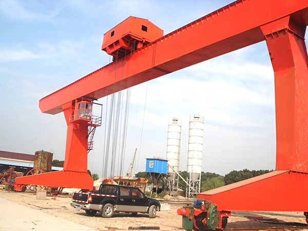 结构特点:其支腿在地面上形成一个门形框架,整个起重机可以在轨道上移动。