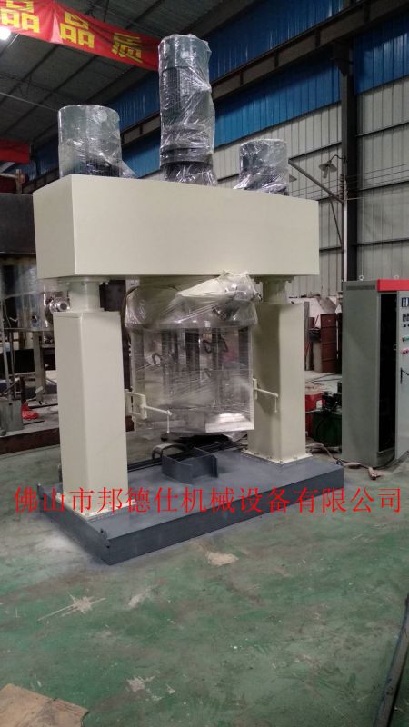 强力分散机是一种高效多功能混合机,可广泛应用于粘合剂、化妆品、化工产品、电池、食品、药品和塑料工业等行业。强力分散机采用变频调速,可满足各种工艺要求。强力分散机釜内有三根不同形式的搅拌器,其中一个搅拌器在绕釜体轴线转动,其余两个搅拌装置又以不同的转速绕自身轴线高速自转,使物料在釜内作复杂的运动,受到强烈的剪切和搓合。设备内山形刮刀绕釜体轴线转动,将粘在壁上和底部的原料刮出参与混合,使其效果更为理想。设备密封性好,可抽真空,具有良好的排气除泡效果。强力分散机缸盖可液压升降,缸体可自由移动,操作十分方便。强力分散机搅拌器的形式,根据物料要求可为多层桨叶式、框式、蝴蝶式、叶轮式等。