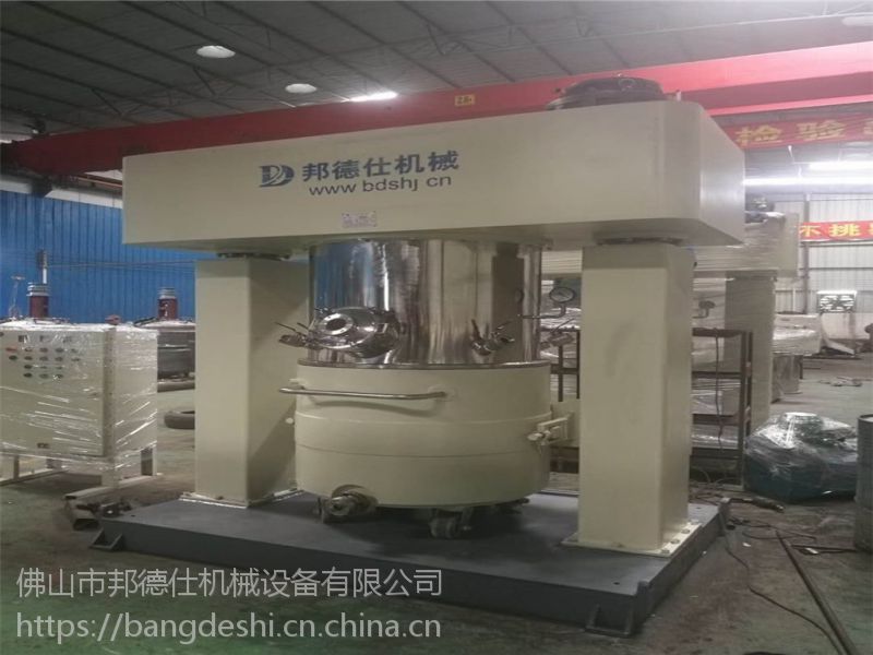 4.釜内带有刮底的框式搅拌浆或多浆叶式搅拌浆,在公转的同时也自转,使物料上下及四周流动,从而可在很短时间内达到混合效果.釜内另外一个或两个高速分散器,也在公转的同时高速自转,使物料受到强列的剪切与分散混合,效果是普通混合机的数倍;