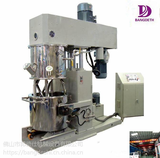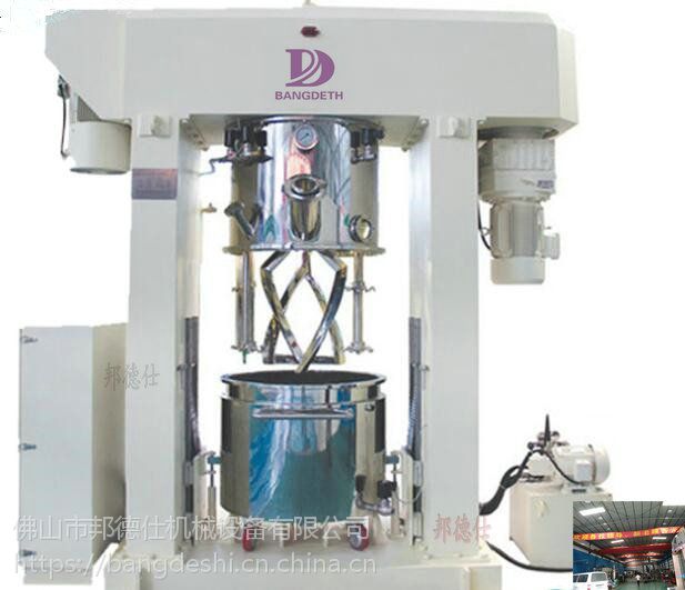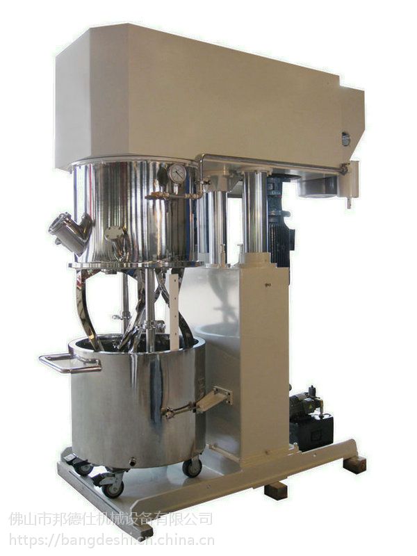 是一种集反应、混合、混炼、分散为一体的高效、多用途混合设备。双行星高速真空搅拌机适用于各行业的液-液、固-液、膏体-膏体、粉-膏、物料密度、比例悬殊、从低粘度到高粘度(150万Cps)的生产工艺中。适用于能源、电子电器、化学品、化妆品、日化品、食品等行业的应用。根据物料粘度的不同,设计不同的行星轮传动比,扭矩变化区间大,是胶黏剂、硅胶、锂电池浆料等行业搅拌混合产品;同时设备带刮壁刮底功能,清洗方便,配套独特的控制系统,操作安全便捷;设备可另选配挤出装置,实现搅拌、出料一体化作业。对于有温度要求的物料,可配套合适的模温机,独立操作,温度控制精度高。