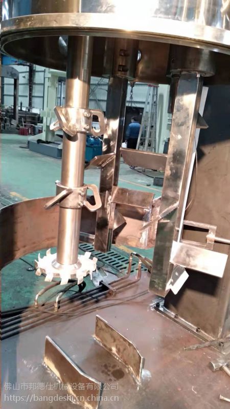 4.釜内带有刮底的框式搅拌浆或多浆叶式搅拌浆,在公转的同时也自转,使物料上下及四周流动,从而可在很短时间内达到混合效果.釜内另外一个或两个高速分散器,也在公转的同时高速自转,使物料受到强列的剪切与分散混合,效果是普通混合机的数倍;