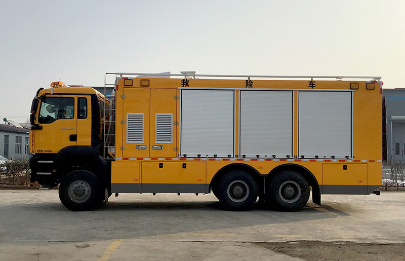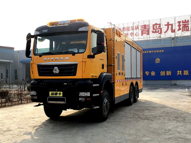 青岛九瑞汽车有限公司越野6X6抢险车,是在中国重型汽车集团--汕德卡消防专用二类底盘的基础上加装带卷帘门的封闭式厢体和随车液压尾板、救险装备后而成的新型抢险救援车辆,箱内配备发电机、切割机、电焊机、水泵等各种应急救险设备,主要是用于各种场合的工程救险。
