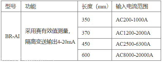 功能: BR系列产品应用电磁感应原理,对电网中的交流大电流进行实时测量,采用真有效值和线性补偿技术,将其隔离变换为标准的直流信号输出。