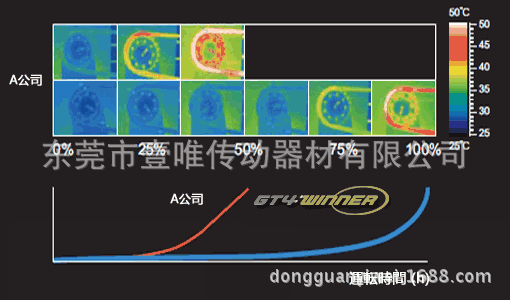 采用新开发的硬化一体套筒,实现了不错的磨损寿命。使用热红外仪器对磨损比较测试链条进行观察,其他品牌的链条在“GT4 WINNER”运行时间一半以下时,已经发生断油,发热的现象。