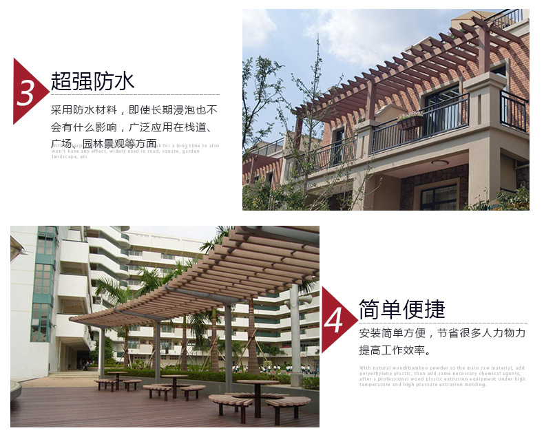 (1)防水、防潮。根本解决了木质产品对潮湿和多水环境中吸水受潮后容易腐烂、膨胀变形的问题,可以使用到传统木制品不能应用的环境中。