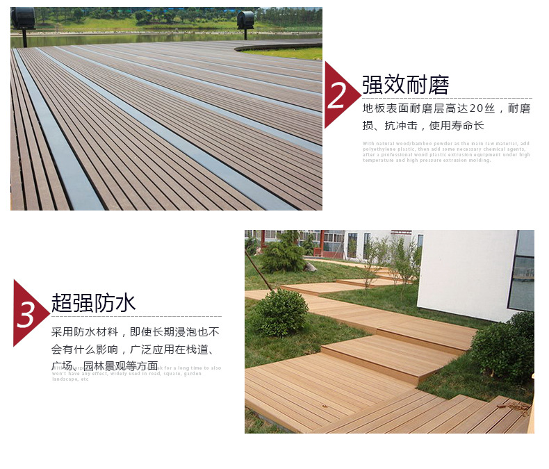 (1)防水、防潮。根本解决了木质产品对潮湿和多水环境中吸水受潮后容易腐烂、膨胀变形的问题,可以使用到传统木制品不能应用的环境中。
