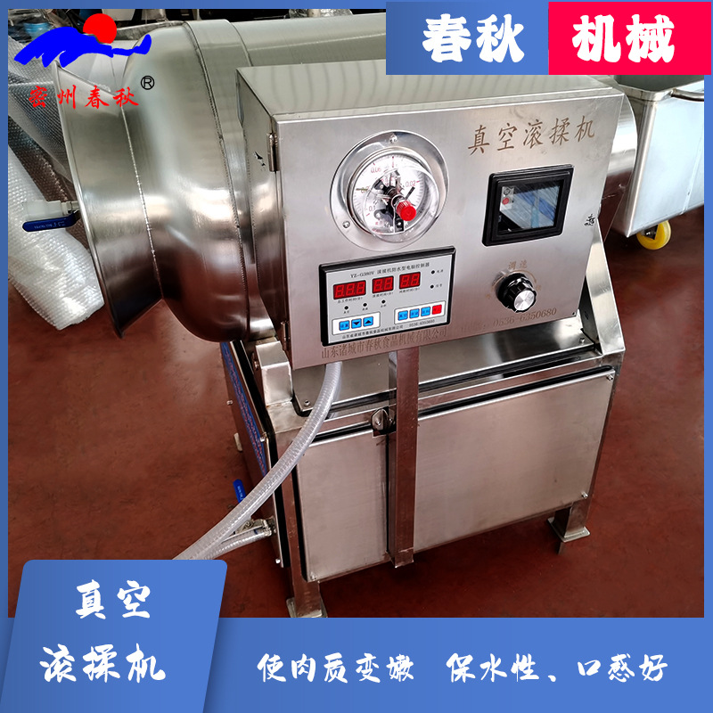 滚揉机是利用物理冲击的原理,让肉在滚筒内上下翻动,相互撞击、摔打、达到按摩、腌渍作用。滚揉机可以使肉均匀的吸收腌渍,可以提高肉的结着力及产品的弹性;可以提高产品的口感及断面效果;可以增强保水性,增加出品率;可以改善产品的内部结构,节能高效。整机采用不锈钢制造,结构紧凑,滚筒两端均采用旋压式封帽结构,增加滚筒内的摔打空间,使滚揉产品的效果均匀,噪音小,性能可靠,操作简便,使用效率更高。