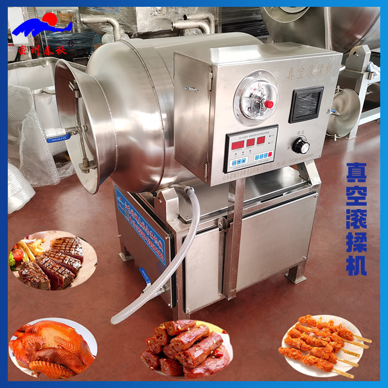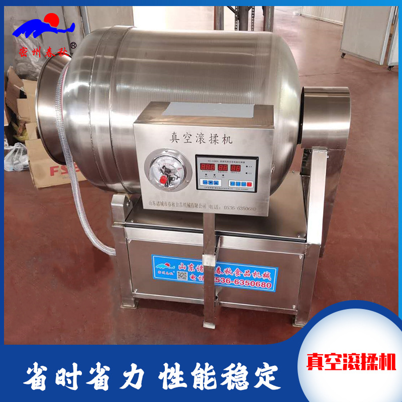 真空滚揉机也叫真空腌制机,主要是将加工的肉类,如牛肉,羊肉,鸡肉,鸭肉,鹅肉,猪肉,鱼肉,蛋及蔬菜,果品放在真空状态内,可提高调味品进入肉品的速度,并保持肉内的水分。真空滚揉机是将块状肉在真空状态下,通过筒体转动进行滚揉。筒体转动时,块状肉在真空状态下膨胀,纤维组织被拉开,在导叶片的作用下沿筒壁作向前→向后→向里→向前的回旋运动,互相挤压,同时沿筒壁切向翻滚、摔打。这样使肉体蛋白质分解成水溶性蛋白,易被人体吸收。还能以人的口感,喜好使添加剂均匀的深入到块肉中间里,使肉及添加剂溶为一体,以达到肉质鲜嫩,出品率高的目的。