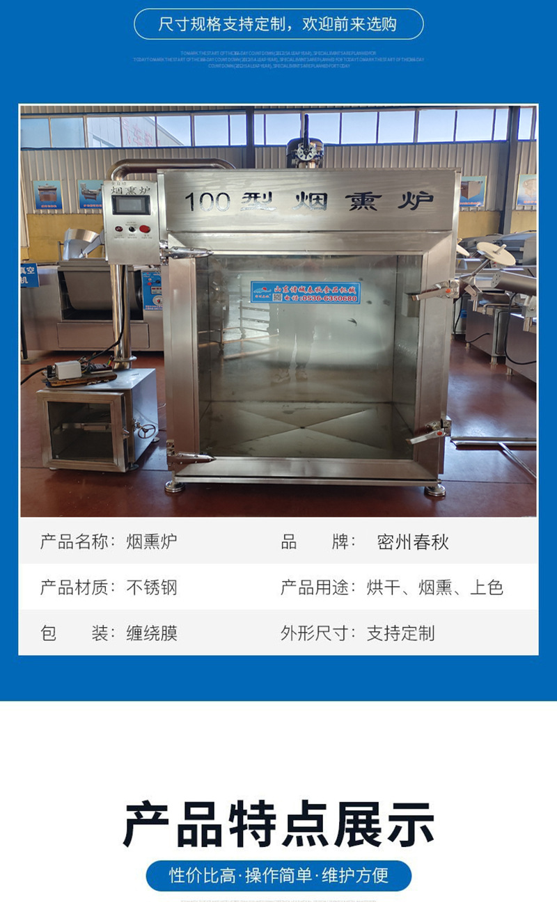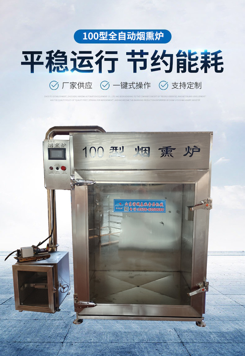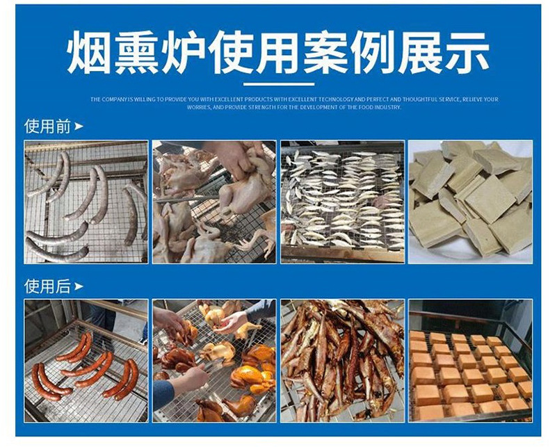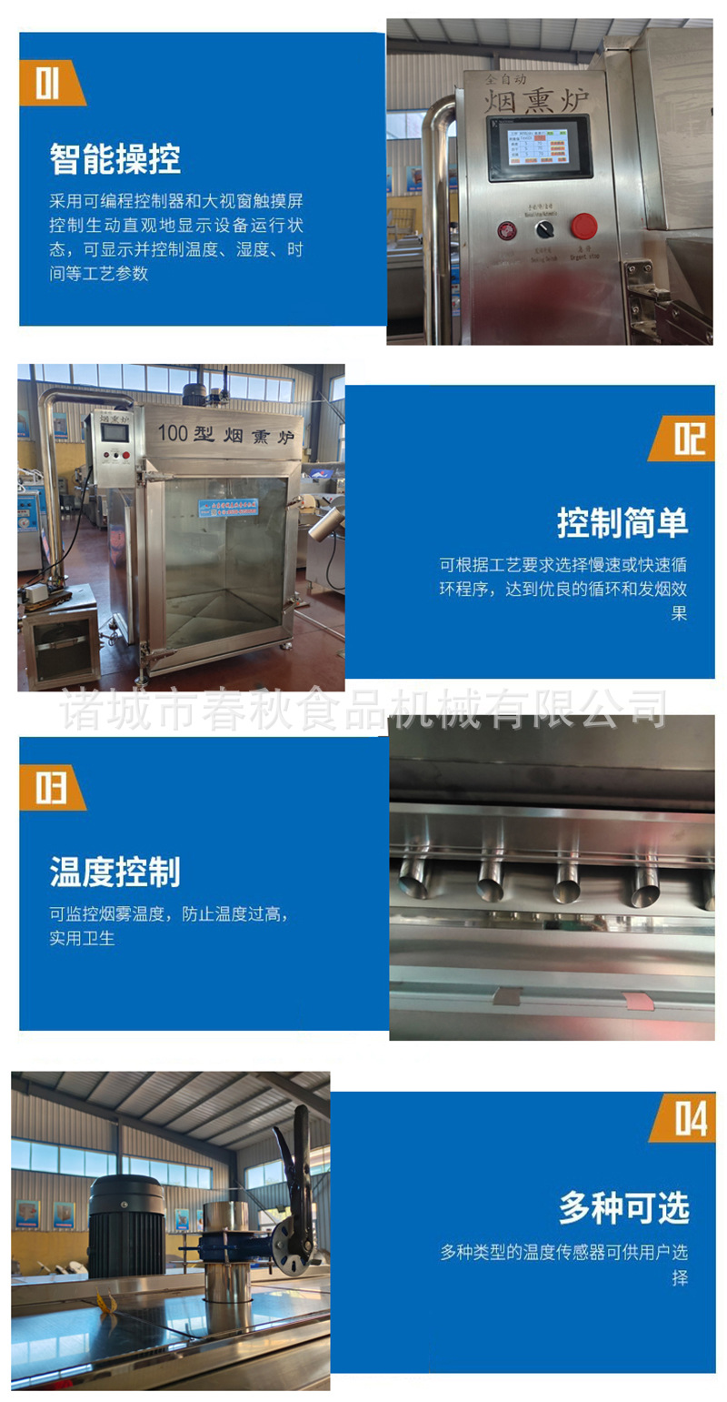 5.电气控制系统:全自动蒸熏箱电控部分采用先进的人机界面与可编程控制器,全自动地控制并监视各个过程。