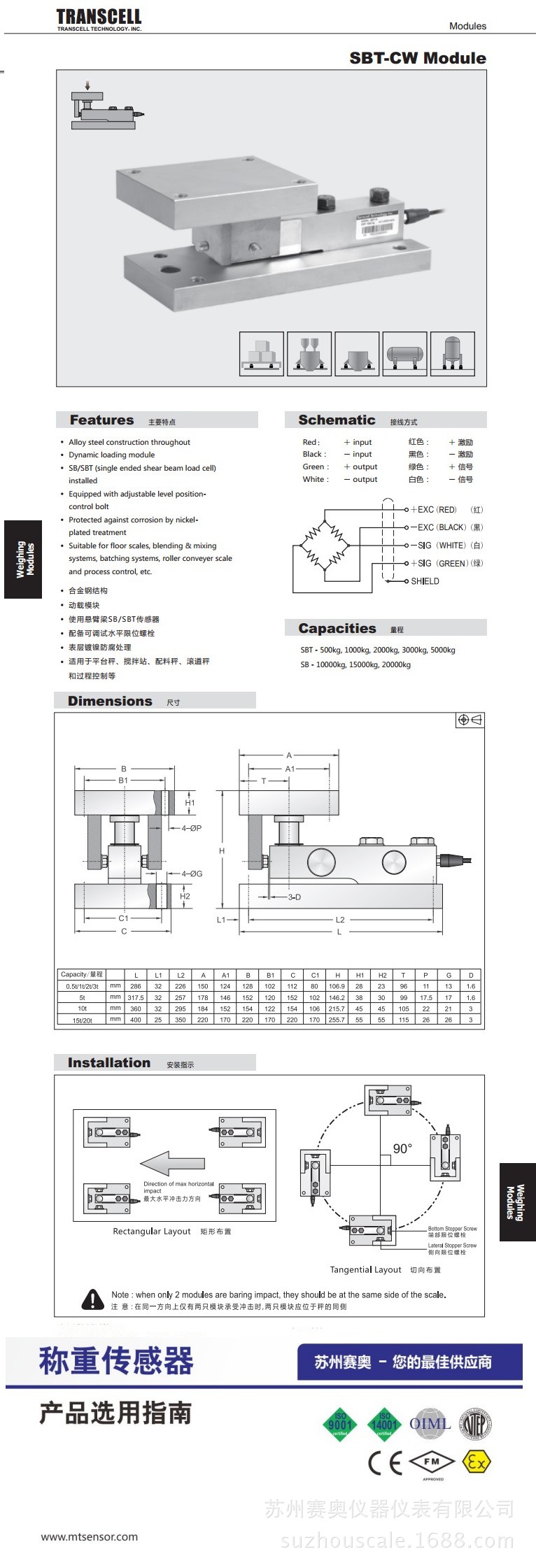 SBT-CW 称重模块 合金钢结构;动载模块;使用悬臂梁SB/SBT传感器;配备可调试水平限位螺栓;表层镀镍防腐处理;适用于平台秤、搅拌站、配料秤、滚道秤和过程控制等;