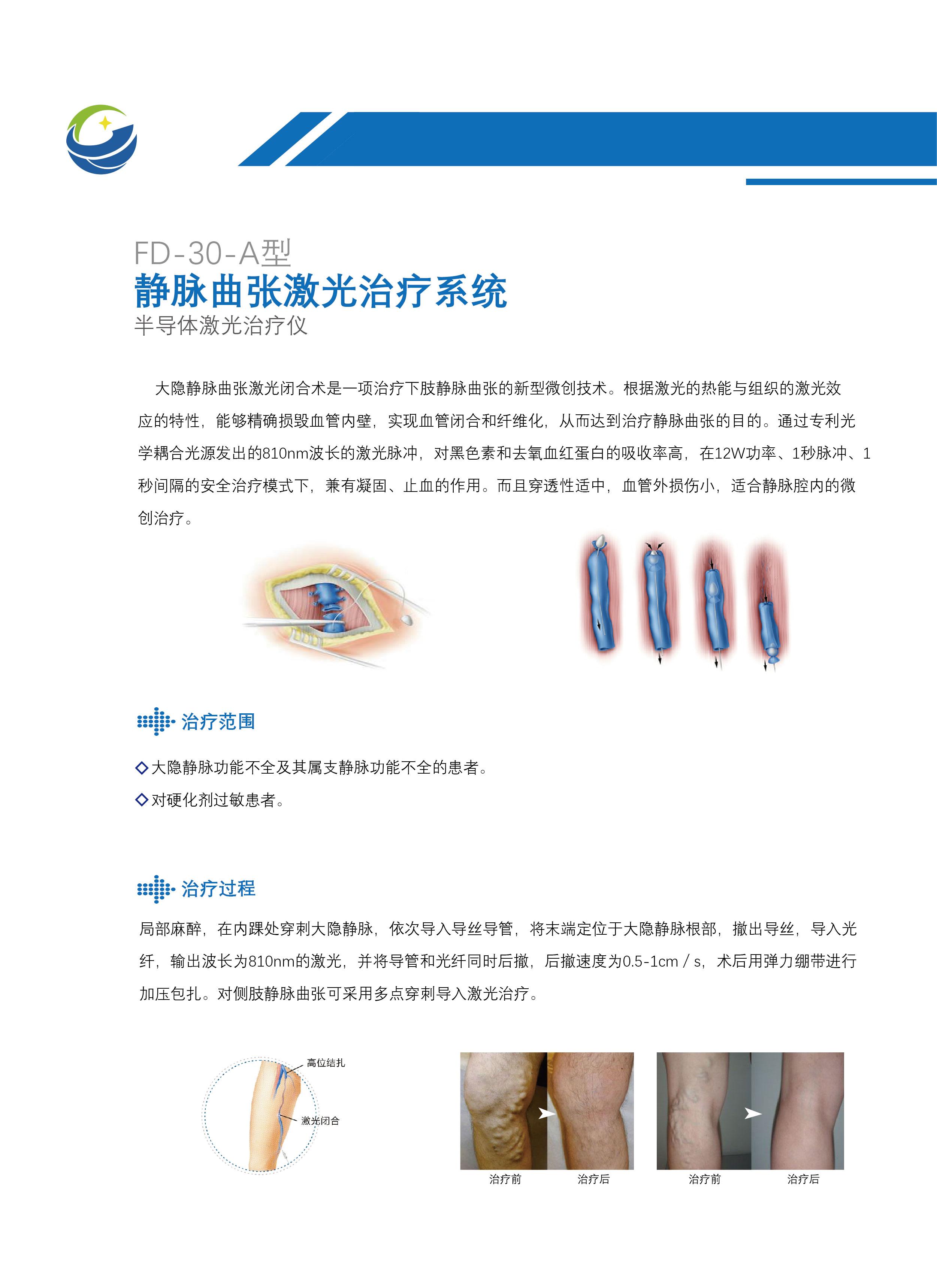 FD-30-A 型静脉曲张激光治疗仪的临床应用中,术中患者创面无出学, 术后恢复快,避免或减少患者的住院时间;术中减少了消耗性材料,缩短手术时间,既提高了医生的工作效率又大大降低了患者的身心痛苦和经济负担,且为患者节约了大量的宝贵时间。