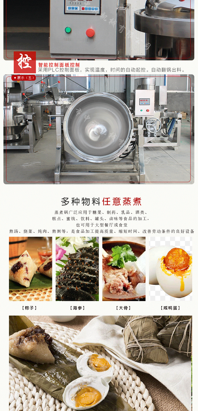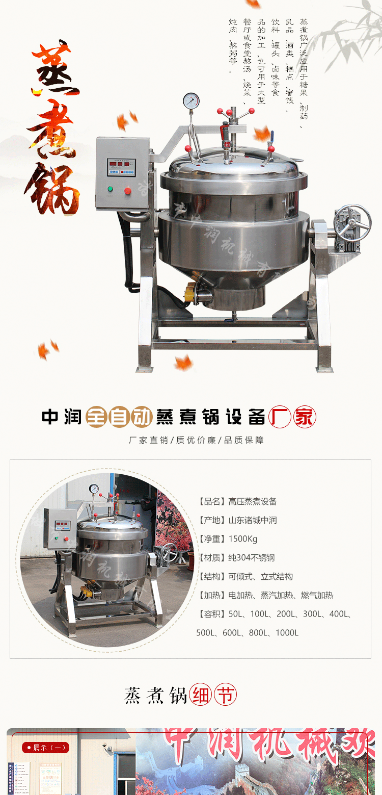 可倾式纳豆蒸煮锅 红豆蒸煮锅 大型蒸煮高压锅广泛应用于糕点、蜜饯、饮料、罐头、卤味等食品的加工,也可用于大型餐厅或食堂熬汤、烧菜、炖肉、熬粥等,是食品加工提高质量、缩短时间、改善劳动条件的良好设备。蒸煮锅的分类:1、按加热方式分为:电加热蒸煮锅、蒸汽加热蒸煮锅。2、按形式分为:立式蒸煮锅、可倾式蒸煮锅。
