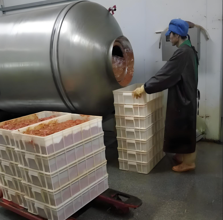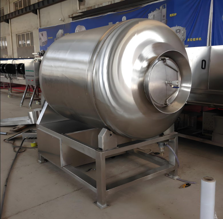 桨叶与滚筒轴线夹角较大:会使肉块在滚动过程中获得更大的轴向分力,推动肉块沿滚筒轴线方向移动的速度更快,加快肉块在滚筒内的循环,提高滚揉的效率和均匀性,但可能对肉块的冲击力也较大,如果滚揉时间控制不当,可能会对肉质造成一定损伤。