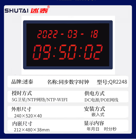 【产品名称】:述泰药厂专用嵌入式有线POE供电自动校时单面LED网络同步时钟
