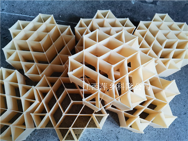设计的六个凸出的三角形支脚,可以使上下两层填料以一定的距离相互隔离,从而增加了气液相的自由面积和气相在分配的空间,较好地改善了气液传质接触界面的不断更新,提高了传质效率;