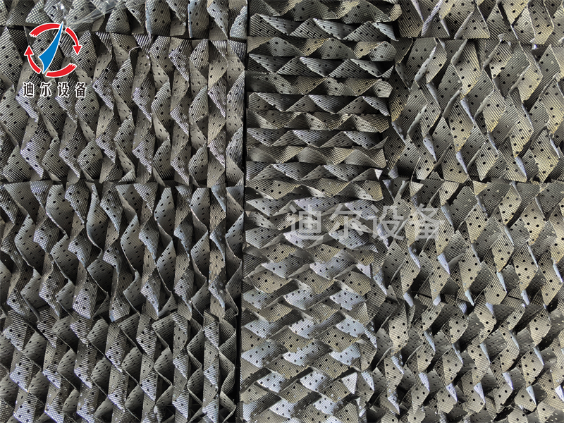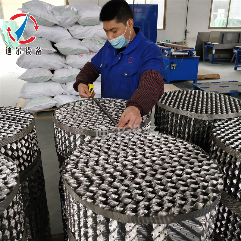 产品主要结构及特点:不锈钢孔板波纹规整填料的主要特点是直接将不锈钢金属板经冲切拉伸成较小尺寸的菱形网孔板,而后经冲压成波纹片,进而组装成填料盘。它综合了金属丝网波纹填料和金属板波纹填料的性能优势,是一种既具有较高效率,又有较格的新型填料。由于比表面积大,它效率较高。规则的菱形网易为液膜覆盖,凹凸不平的表面强化了液膜湍动、混合及表面更新。